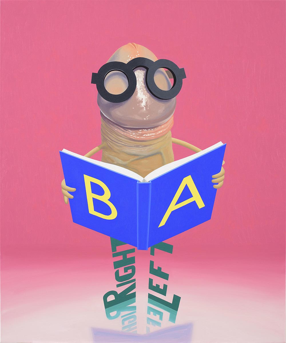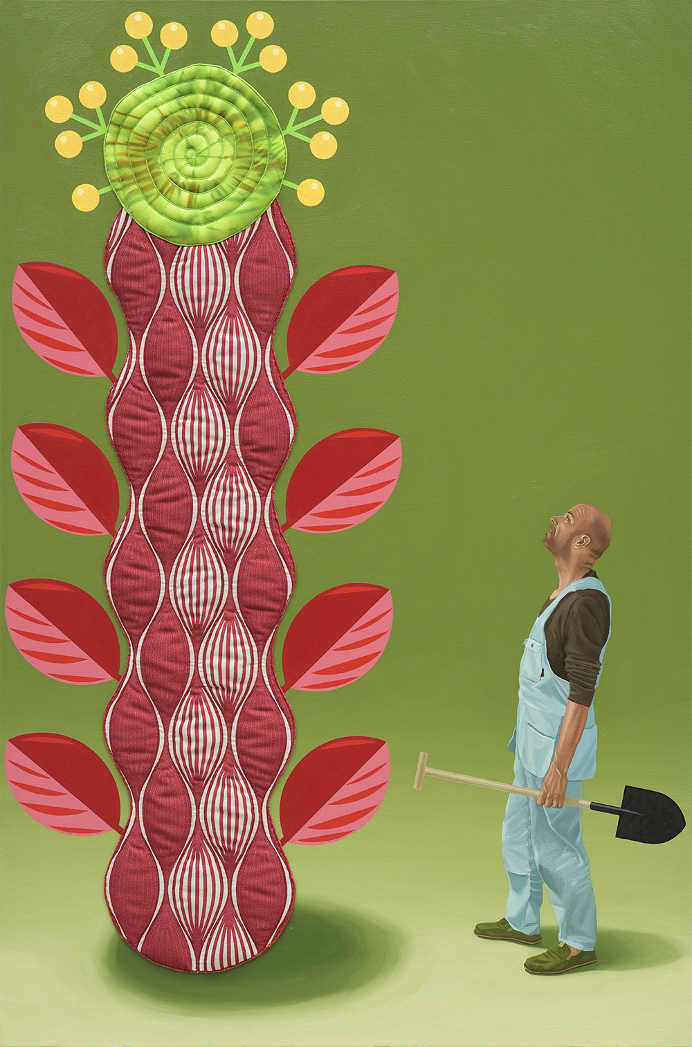 Mu armas GMO, õli ja akrüülvärv ning tekstiilobjekt lõuendil, 141 × 93 cm, 2017. Koostöös Maire Forseliga