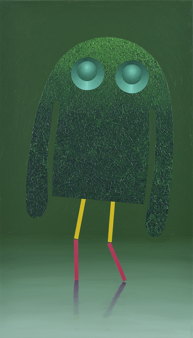 Roheline värdjas, õli ja akrüülvärv ning plastdetailid lõuendil, 87 × 50 cm, 2014