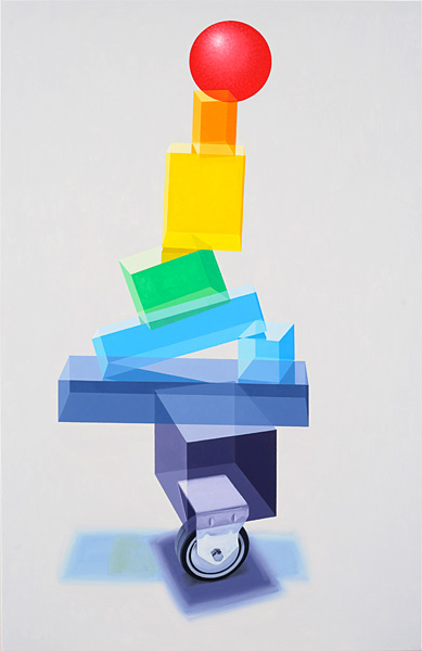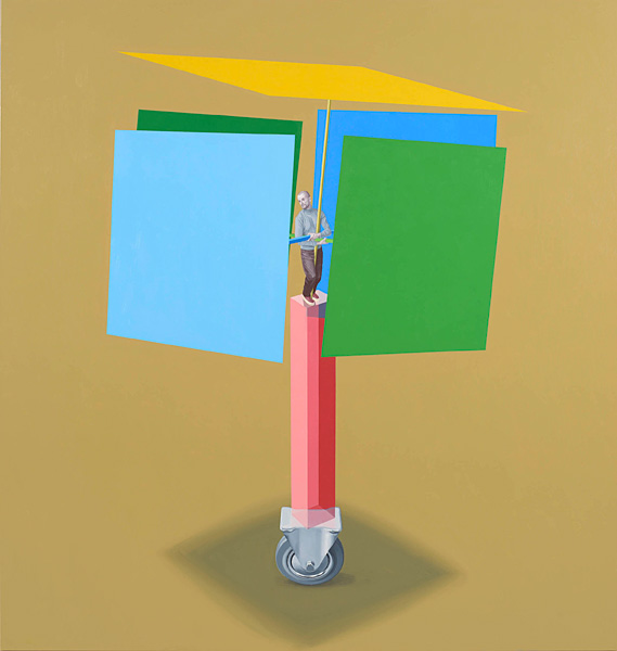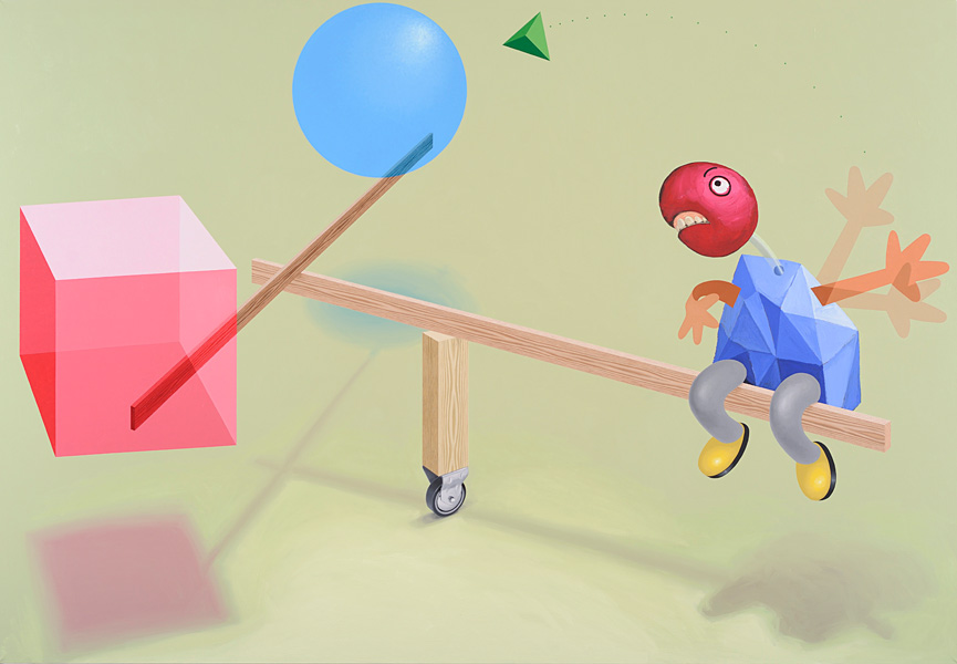 Vaikelu värdja ja geomeetriliste põhivormidega, õli ja akrüül lõuendil, 270 × 390 cm, 2012